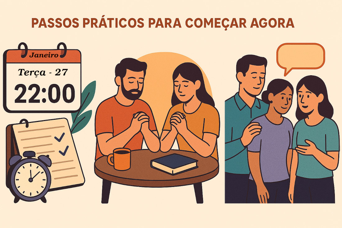 1. Agendem um horário fixo de oração juntos: Não deixem “quando der tempo” — marquem dia e hora específicos. Comecem com 5 minutos, três vezes por semana (exemplo: segunda, quarta e sexta às 22h). Anotem na agenda. Compartilhem pedidos, agradeçam juntos e peçam sabedoria. O que não tem horário, não acontece.